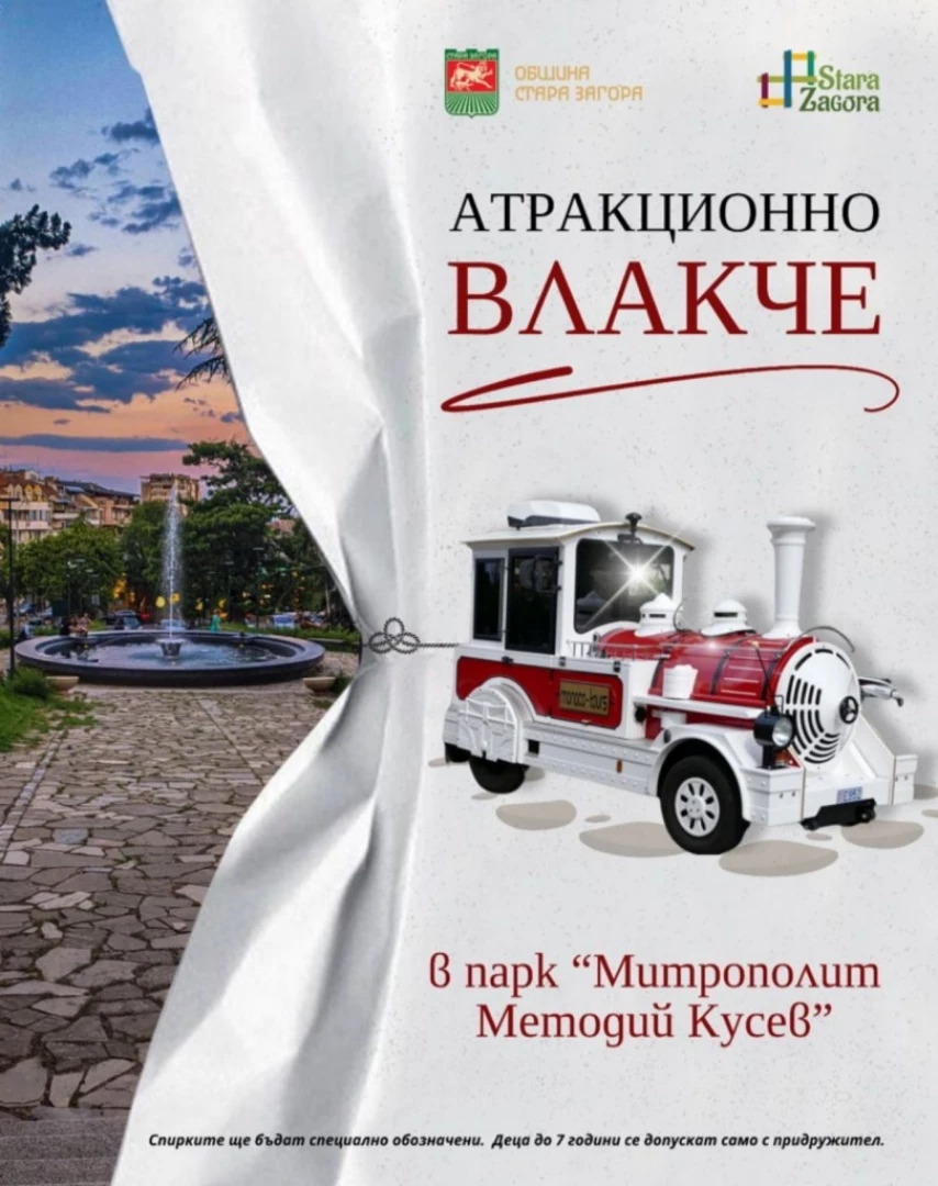 Туристическото влакче, което представя на жителите и гостите на Стара Загора емблематичния парк „Митрополит Методий Кусев“ (Аязмото), вече ще работи само в петък, събота и неделя, съобщиха от пресцентъра на Общината. Атракционът тръгва от паркинга на Летния театър преминава по ул. „Свети Апостол Карп“, бадминтон игрища, въжена градина, паркинг на зоопарка и се връща обратно към началната точка на тръгване.