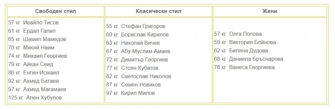 Така към настоящия момент сагата с натурализираните борци изглежда решена, тъй като всички те ще защитават цветовете на България. В свобдния стил страната ни има представители във всичките 10 категории. Освен Мамедов в тима са още Микяй Наим (70), втори в Европа през 2023-а, Михаил Георгиев (74), носител на златния пояс този сезон, а също Ахмед Магамаев (97), пети в света през 2025-а, и Ален Хубулов (125), европейски шампион до 23 г. през 2024-а. В най-леката категория до 57 кг ще излезе Ивайло Тисов, пети на континента през миналия сезон. Отборът ще бъде воден от треньорите Радослав Великов, Йордан Денев и Мирослав Киров.