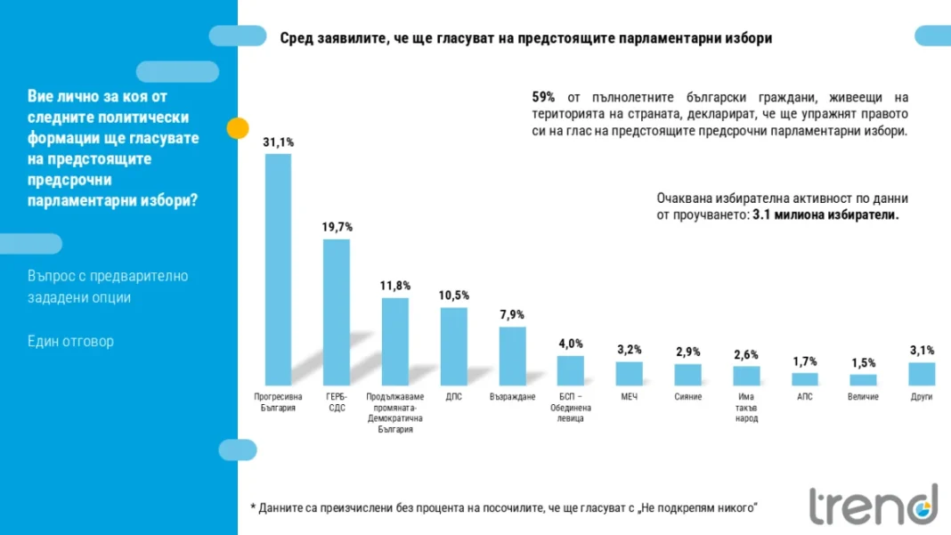 Според проучването „Прогресивна България“ запазва водещата си позиция с 31,1% подкрепа сред решилите да гласуват. На второ място се нарежда ГЕРБ с 19,7%, следвани от „Продължаваме промяната – Демократична България“ с 11,8%.