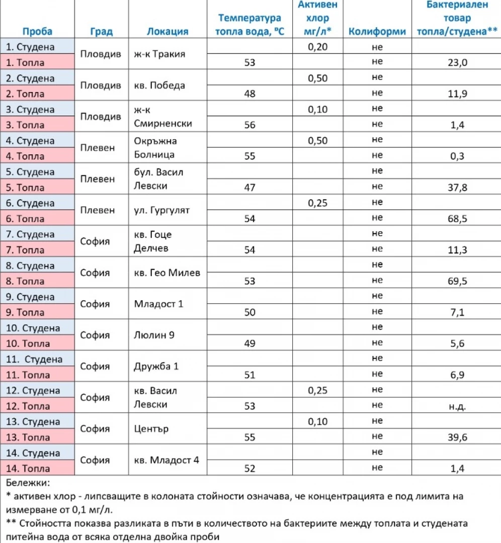 В 12 от 13 двойки проби (студена/топла вода) топлата вода е замърсена с до 22 пъти повече бактерии в средата на проучването. Максимумът е впечатляващите 69,5 пъти в кв. „Гео Милев“ в София. На ул. „Гургулят“ в Плевен е измерен 68,5 пъти повече бактериален товар в топлата вода в сравнение със студената.