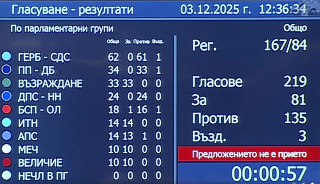„Против“ референдума гласуваха 135-има депутати (ГЕРБ, ПП-ДБ, „ДПС-Ново начало“, БСП), 3-ма се въздържаха, а 81 бяха „За“ („Възраждане“, АПС, ИТН).