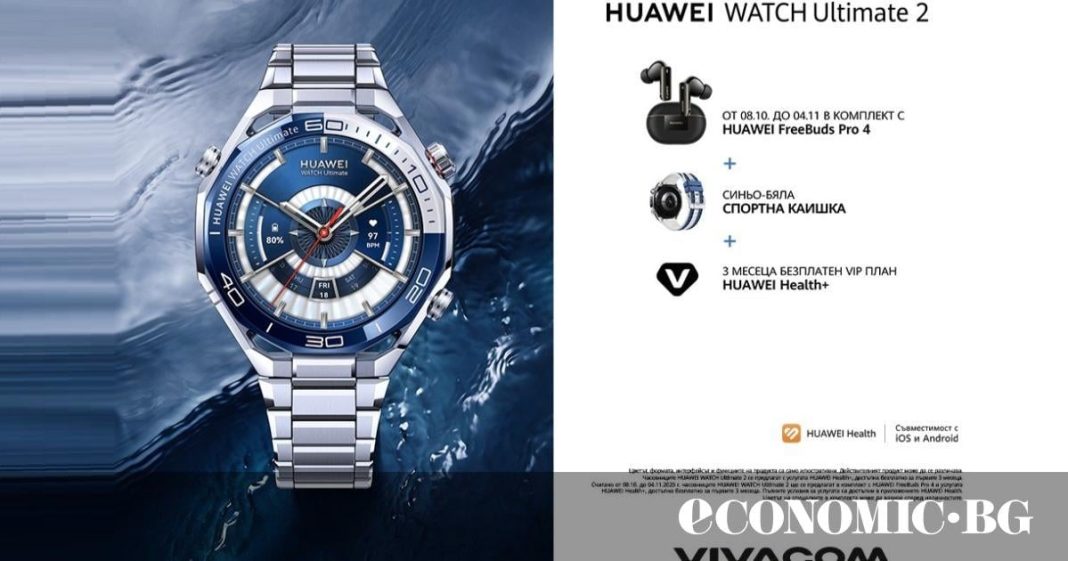 Vivacom стартира продажбите на най-новите устройства от Huawei – смарт часовника Huawei Watch Ultimate 2, Huawei Watch D2 и слушалките Huawei FreeBuds 7i. Моделите вече са налични в търговската мрежа на телекома и онлайн на vivacom.bg в рамките на специална онлайн кампания от 8 октомври до 4 ноември 2025 г. В рамките на онлайн кампанията Huawei Watch Ultimate 2 се предлага в комплект със слушалки HUAWEI FREEBUDS PRO 4 и 102.26 € | 200 лв. намаление с е-ваучер включено в цената с планове Unlimited.