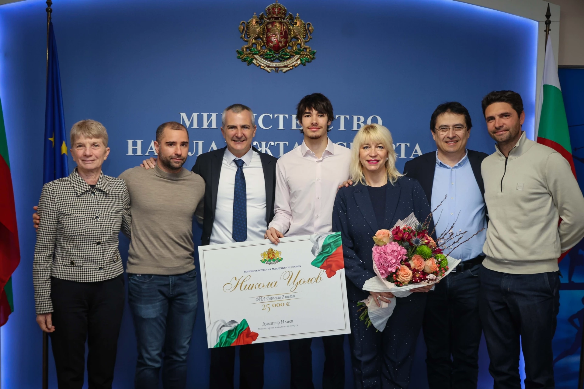 Служебният министър на спорта Димитър Илиев връчи премия в размер на 25 000 евро на звездата във Формула 2 Никола Цолов, който оглавява генералното класиране. Паричната награда се отпуска от министъра на младежта и спорта по Наредба №5 на ММС за постигнати изключителни спортни резултати, обявиха от пресцентъра на ведомството днес, 24 март. Младият ни суперталант в моторните спортове завърши на второ място в крайното класиране в последния си сезон във Формула 3, а само преди седмици спечели откриващото състезание за сезона във Формула 2 в Австралия.
