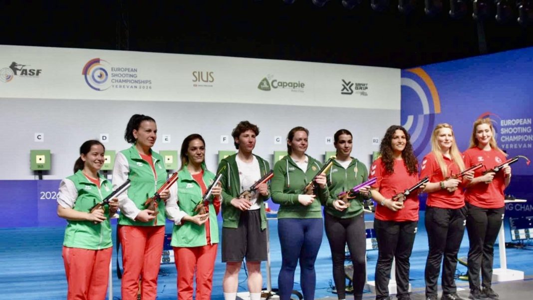 Българските състезателки спечелиха сребро на пистолет трио в последния ден от Европейското първенство по спортна стрелба с пневматично оръжие в Ереван, Армения. Родният състав – Антоанета Костадинова, Мирослава Минчева и Адиел Илиева, отстъпи във финала на Унгария с 6:16. Бронзовите медали са за тима на Турция, който в малкия финал се наложи над Хърватия с 16:8.