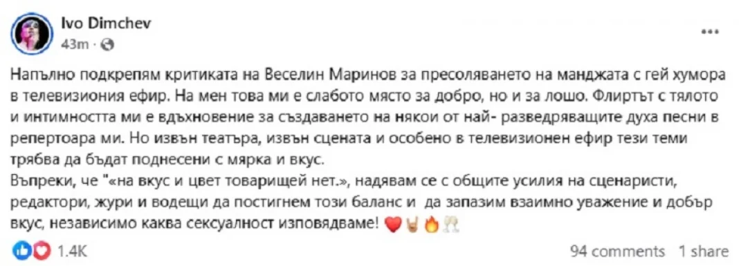 „Напълно подкрепям критиката на Веселин Маринов за пресоляването на манджата с гей хумора в телевизиония ефир. На мен това ми е слабото място за добро, но и за лошо. Флиртът с тялото и интимността ми е вдъхновение за създаването на някои от най-разведряващите духа песни в репертоара ми. Но извън театъра, извън сцената и особено в телевизионен ефир тези теми трябва да бъдат поднесени с мярка и вкус. Въпреки, че „на вкус и цвет товарищей нет“, надявам се с общите усилия на сценаристи, редактори, жури и водещи да постигнем този баланс и да запазим взаимно уважение и добър вкус, независимо каква сексуалност изповядваме!“, написа Иво Димчев.
