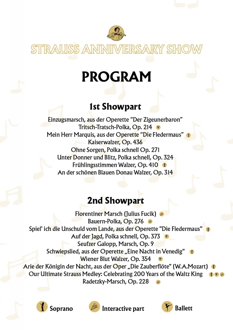 Ще се насладим на най-обичаните и популярни арии, полки, маршове и валсове на гениалния композитор. Програмата ще включва и препратка от творчеството на друг велик творец, а именно Волфганг Амадеус Моцарт. Запознайте се с пълната програма тук.
