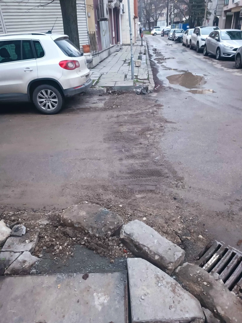 Така изглежда кръстовището на ул. „Хан Пресиян“ и ул. „Александър Македонски“ на 5 март – само няколко часа след като през нощта е разбивано с къртачна машина. Днес тротоарът вече е разбит и се полагат тръби за нови кабели; снимка: Actualno.com