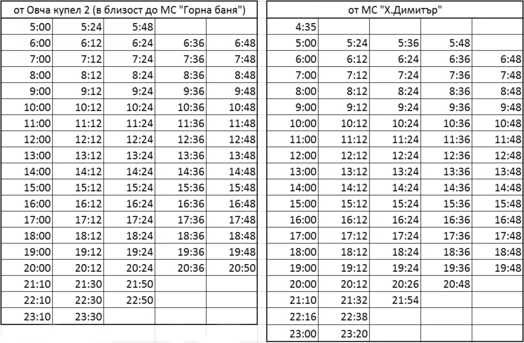 От двете крайни спирки – МС „Хаджи Димитър“ и „Овча купел 2“ (в близост до МС „Горна баня“), автобусите ще тръгват съответно в 4:35 и 5:00 часа сутринта, а последният курс ще бъде от 23:20 и 23:30 часа вечерта.