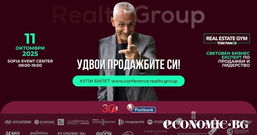 Остават броени дни до Международната конференция Realto Group 2025, която ще се проведе на 11 октомври 2025 г. в Sofia Event Center, Paradise Mall, и ще събере водещи експерти, предприемачи и лидери от сектора на недвижимите имоти в България и по света.