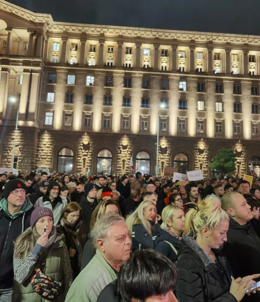 Събралото се множество срещу приемането на бюджета за 2026 г. чинно изгледа и изслуша извънредното заседание на бюджетната комисия, излъчвано на видеокран пред сградата на парламента.