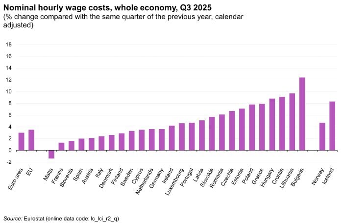 Справка на Economic.bg в статистиката, която е за третото тримесечие на 2025 г. (бел. ред. – данни за Q4 предстои да бъдат публикувани по-късно този месец), сочи, че тогава разходите за почасово заплащане са се увеличили най-силно на годишна база в България (+12.4%), Литва (+9.7%), Хърватия (+9.1%) и Унгария (+8.8%).