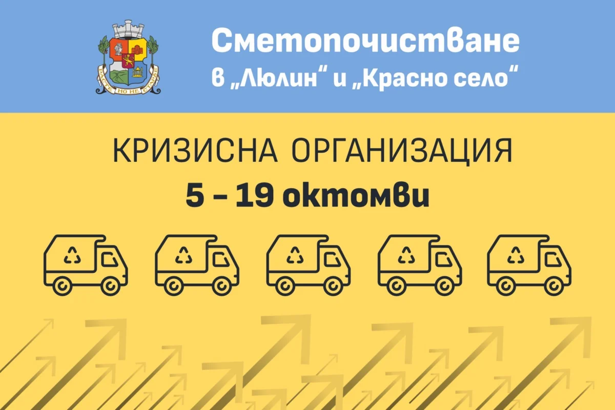 Столична община въвежда кризисна организация за сметопочистването в столичните квартали “Люлин” и “Красно село” от 5 до 19 октомври или до второ нареждане, съобщават от пресцентъра на общинската администрация.