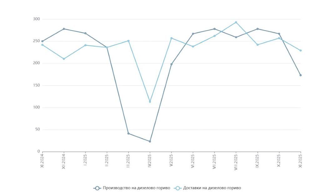 Най-впечатляващата тенденция в доклада на НСИ е рязкото свиване на производството на нефтени продукти. Общото производство на течни горива през ноември е намаляло с 42.1% спрямо октомври, достигайки едва 341 хил. тона. На годишна база свиването е с 31.9%.