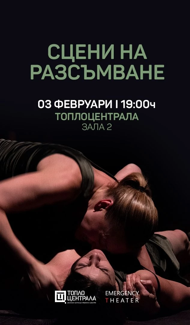 Представление-обръщение към духа на времето, „Сцени на разсъмване“ на Emergency Theater е оратория за човешката безпомощност, за страха от загубата на човека до нас, за копнежите и илюзиите, за силата и утехата на пробуждането. Между съня и кризата на предстоящия ден е времето на проясняването, на истината, която изплува между екзистенциалната умора и актуалната тревожност. Как издържаме, как живеем, какво се случва с нас, когато чувствата ни се обръщат навътре и отекват в кухината на тялото. Значима репетиция в този живот е репетирането да изразиш чувствата си, а по-висшето – да съумееш да ги споделиш. Като един голям акт на споделеност поставяме публиката в ролята на желания партньор. Предизвикваме я със сцени на еротичното и смъртта, със сцени на личен срам и блян. Сцената се превръща в лаборатория за психодрама, напълно видима за публиката. Превеждаме я в пространството между самотата, която затваря сърцата и самотата, която дава тласък за нова среща.