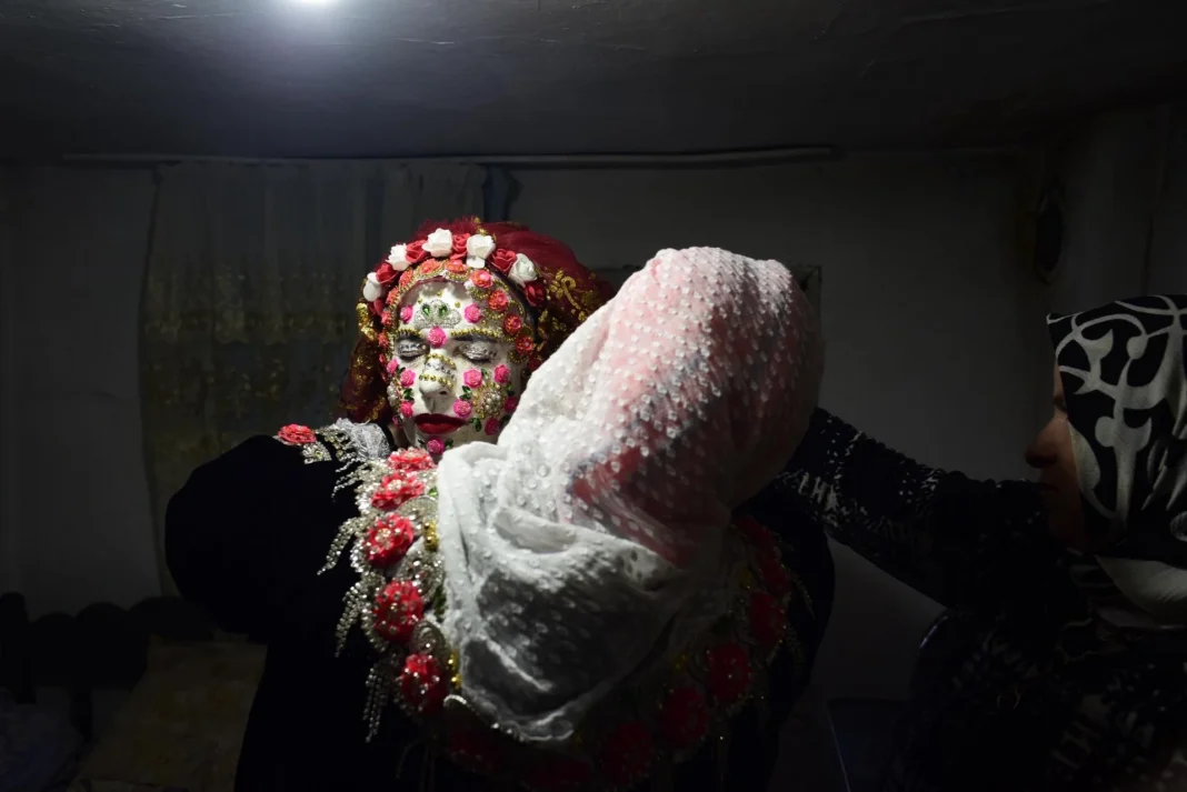 Облечена в традиционни дрехи, булката се извежда пред гостите със затворени очи, докато младоженецът не „откупи“ нейния поглед. В края на ритуала украсата се сваля като знак за встъпването на девойката в новия ѝ социален статус.