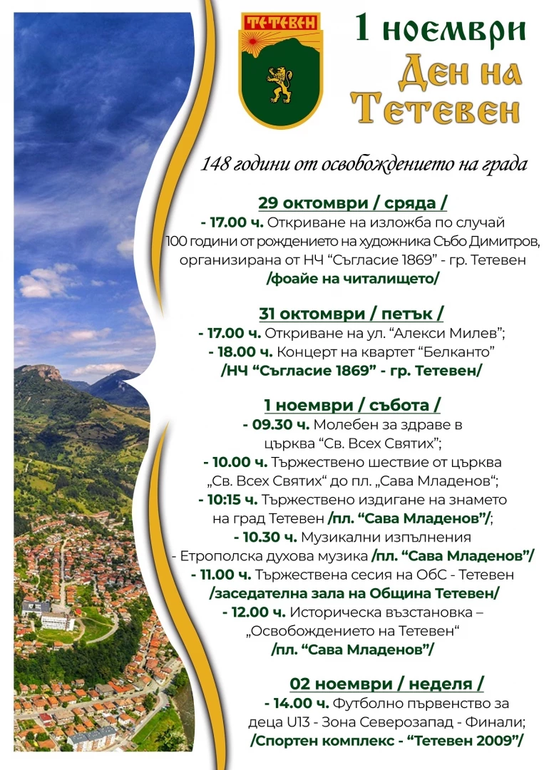 На 1 ноември Тетевен ще отбележи двоен празник – 148 години от освобождението на града от османско владичество и Деня на народните будители. По случай събитията Община Тетевен е подготвила богата програма в дните от 31 октомври до 2 ноември.