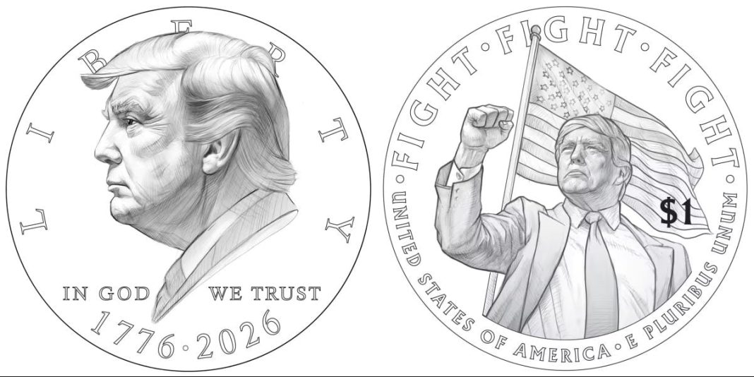 Черновите изображения показват страничния профил на Тръмп на лицевата страна с надпис „Свобода“ отгоре, „Вярваме в Бог“ отдолу и датите 1776 и 2026. На обратната страна е известното изображение на Тръмп, вдигащ юмрук след опита за покушение в Бълтър, Пенсилвания, с думите „БОРБА, БОРБА, БОРБА“ отгоре и американско знаме, развяващо се зад главата му.