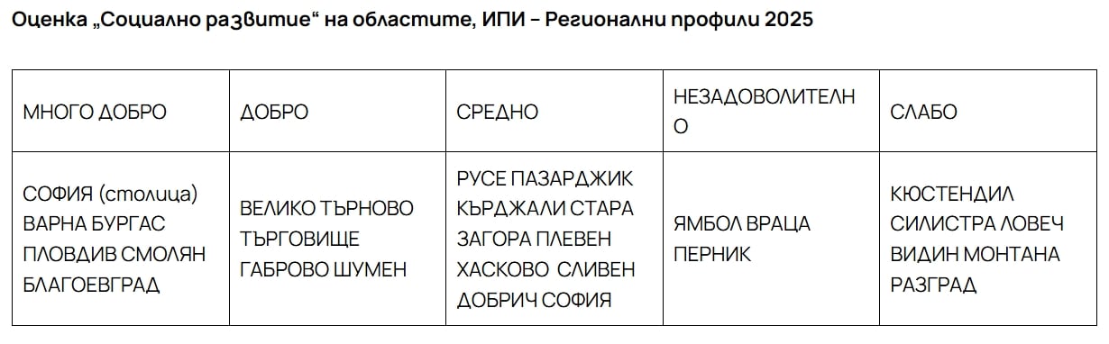Социалното развитие се поляризира още по-ясно: шест области получават „много добър“ резултат, като столицата, Варна, Бургас и Пловдив са сред лидерите в почти всички компоненти – от демография и здравеопазване до образование и туризъм. Високият общ резултат може да бъде постигнат и чрез силно представяне в няколко ключови сфери – пример са Смолян (образование и околна среда) и Благоевград (образование и демография). В дъното са области с неблагоприятна демографска траектория и по-слаби слаби резултати на образованието и здравеопазването.