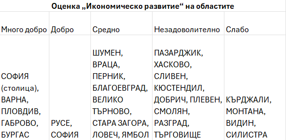 Комплексните оценки по икономическо развитие показват ясно разделение. В групата „много добро“ са областите с висок дял на индустрията и услугите и силна инвестиционна активност; сред отличаващите се е и Габрово, чиято концентрирана промишлена база поддържа висок стандарт на живот. „Добро“ икономическо развитие постигат Русе и София (област), които остават на крачка от лидерите, докато цели девет области са в групата „незадоволително“ – сигнал за ограничена икономическа база и по-ниско качество на работните места.