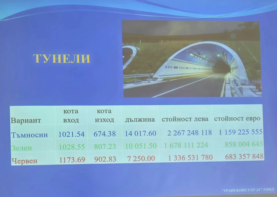 - „Червеният“ вариант е с най-къс тунел от малко над 7.2 километра, като неговата стойност е над 1.3 млрд. лв.