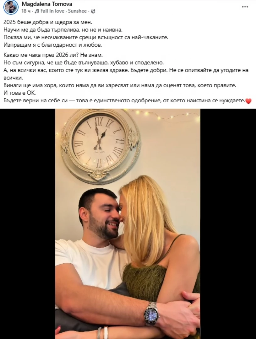 „2025 беше добра и щедра за мен. Научи ме да бъда търпелива, но не и наивна. Показа ми, че неочакваните срещи всъщност са най-чаканите. Изпращам я с благодарност и любов“, написа тя в профила си във Фейсбук, където публикува и видео, на което с Калоян демонстрират близостта помежду си.