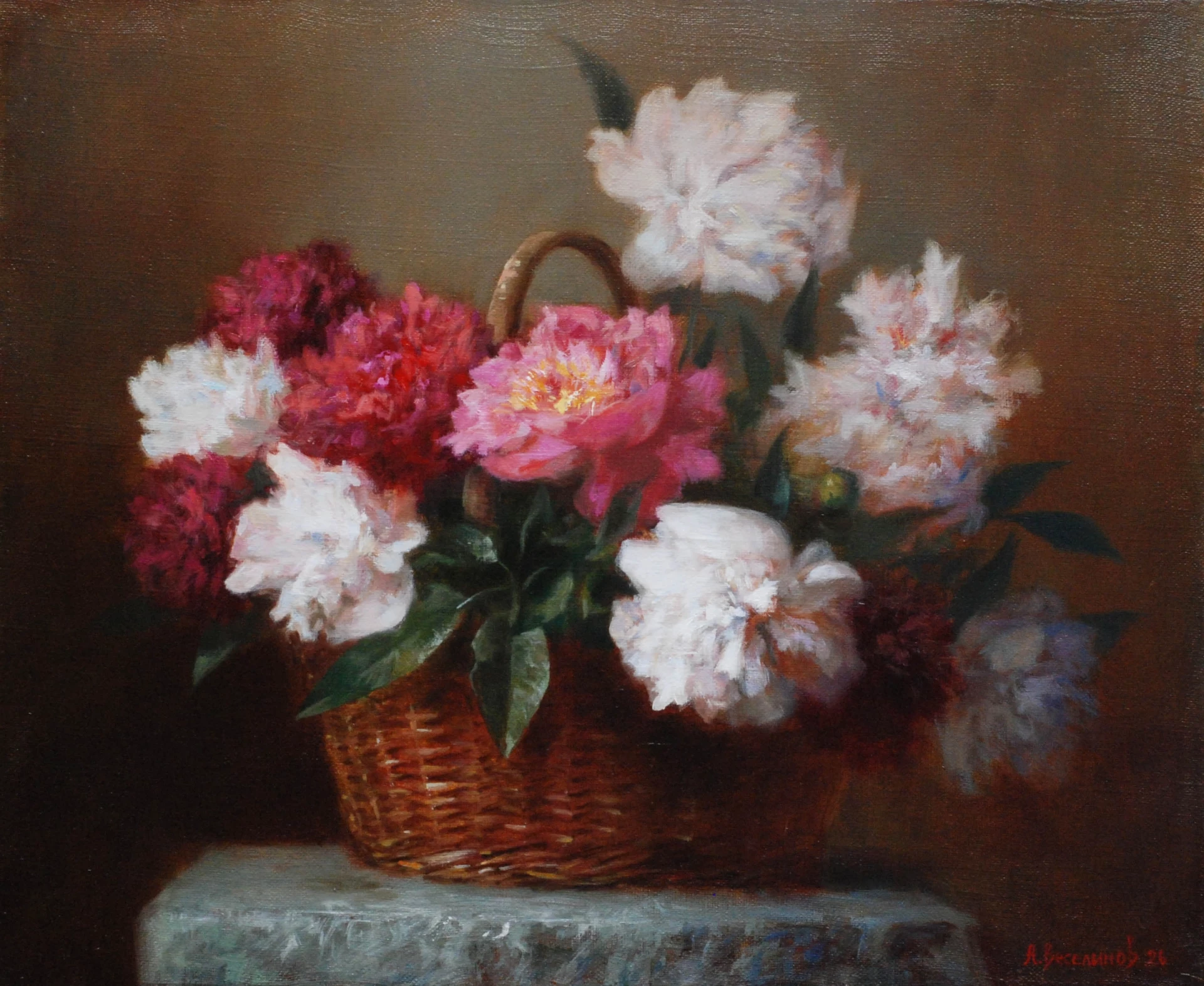 В изложбата ще видим, спечелилите му популярност, сред ценителите, прекрасни натюрморти. Изпълнени с вещина, ползвайки технологията на старата класическа школа, той постига една особена магия в отблясъка на порцелана или пречупването на изображението през овала на стъклената ваза; във восъчната крехкост на всяко листенце и на всяко цветче; в мъха по повърхността на узрелите праскови; в сладостта на смокините, прозираща през презрелите, леко напукани кожици…Така наречената мъртва натура – натюрморт, в платната на Ангел Веселинов оживява. Тя придобива плътност, аромат, движение на светлината и предизвиква истинско усещане за дом, за уют, за конкретен сезон, за празник…