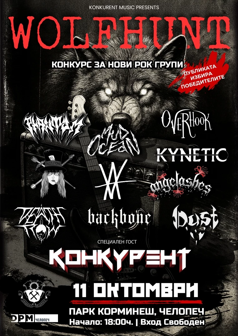 В събота – 11 октомври 2025 г. – парк „Корминеш“ край Челопеч ще се превърне в епицентър на българската рок и метъл сцена. Първото издание на конкурса WOLF HUNT ще събере на едно място 10 нови български банди, които ще представят своята авторска музика в стремеж да покорят първото място, а гост-изпълнител са ветераните от Конкурент. Фестивалът е с вход свободен и обещава да предложи не просто музикална надпревара, а истинско музикално приключение сред природата.