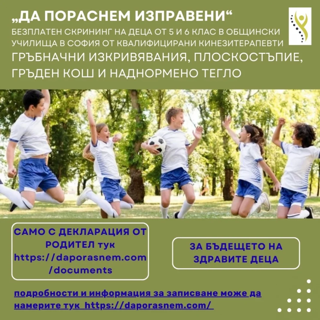 Стартира от днес програмата „Да пораснем изправени“, разработена от ортопеди, педиатри и кинезитерапевти и има за цел да идентифицира и предотврати често срещани, но силно подценявани здравословни проблеми сред подрастващите. Столична община, дирекция „Образование“, стартира изпълнението на Общинската програма, приета от Столичния общински съвет, която се реализира съвместно с лекари от СБАЛ по ортопедия „Проф. Бойчо Бойчев“, Асоциацията на физиотерапевтите в България, Лайънс клуб София „Св. Архангел Михаил“ и Лайънс клуб София „Св. Иван Рилски“, с подкрепата на Българската ортопедична и травматологична асоциация.
