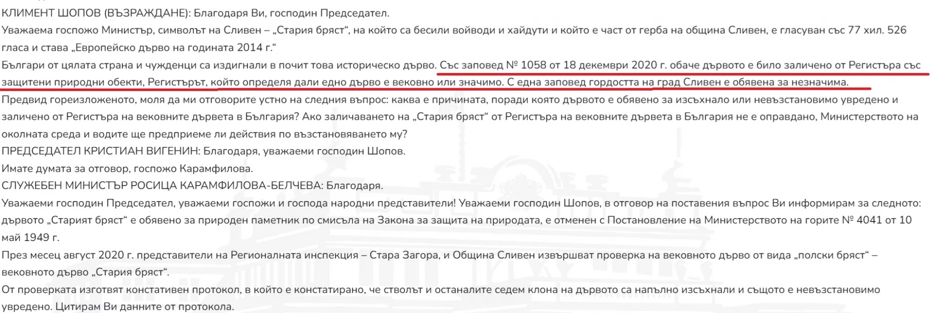 „Но на по-високо ниво отговорните институции нехаят за историческата гордост на страната ни. Старият бряст в Сливен е отписан от регистъра на вековните дървета. Дори имаше парламентарен въпрос. А това беше идеята да е Дърво на Европа – да привлича хора и туристи. Ние мартеница не можем да му сложим, да го украсим за Коледа… даже не е паметник на културата. Грижата за вековните дървета е нулева. Единственото, което се прави за тях, е да влязат в регистъра, оттам нататък – нищо. Не сме гърци или турци, за да правим туризъм от забележителностите ни“, отбеляза още Стефанов.